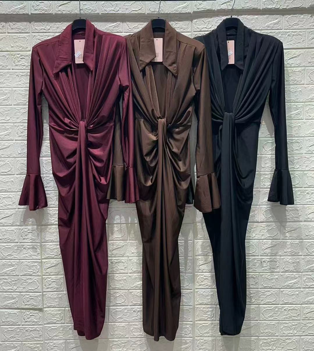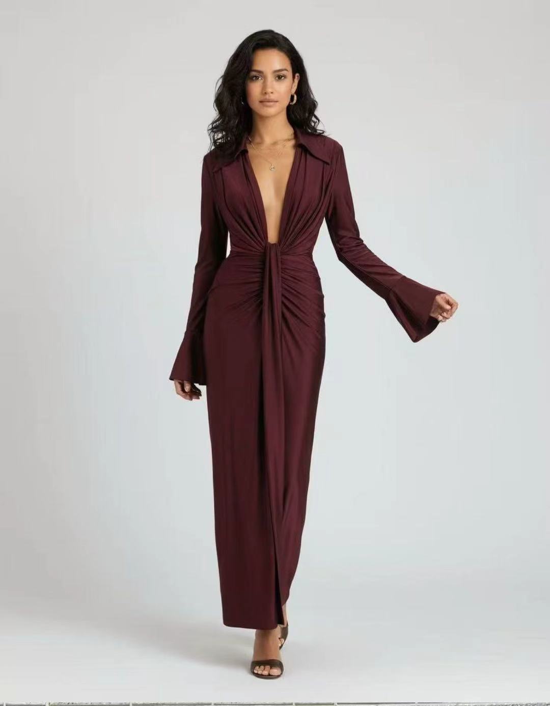 Questo abito lungo presenta una scollatura davanti e maniche lunghe, perfetto per un look chic e sofisticato. Con un design elegante e raffinato, ti farà risaltare in ogni occasione. Aggiungi un tocco di stile al tuo guardaroba con questo abito all'avanguardia.