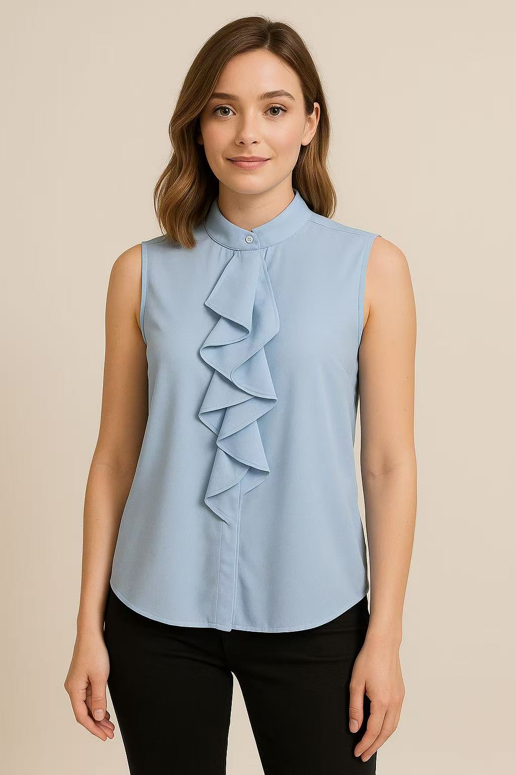 La comodità incontra l'eleganza con la nostra camicia senza maniche con voilà davanti ai bottoni. Realizzata con materiali di alta qualità, questa camicia è perfetta per un look formale ma comodo. Senza maniche per tenere fresca e comoda durante le calde giornate estive, e il voilà davanti ai bottoni aggiunge un tocco di eleganza.
